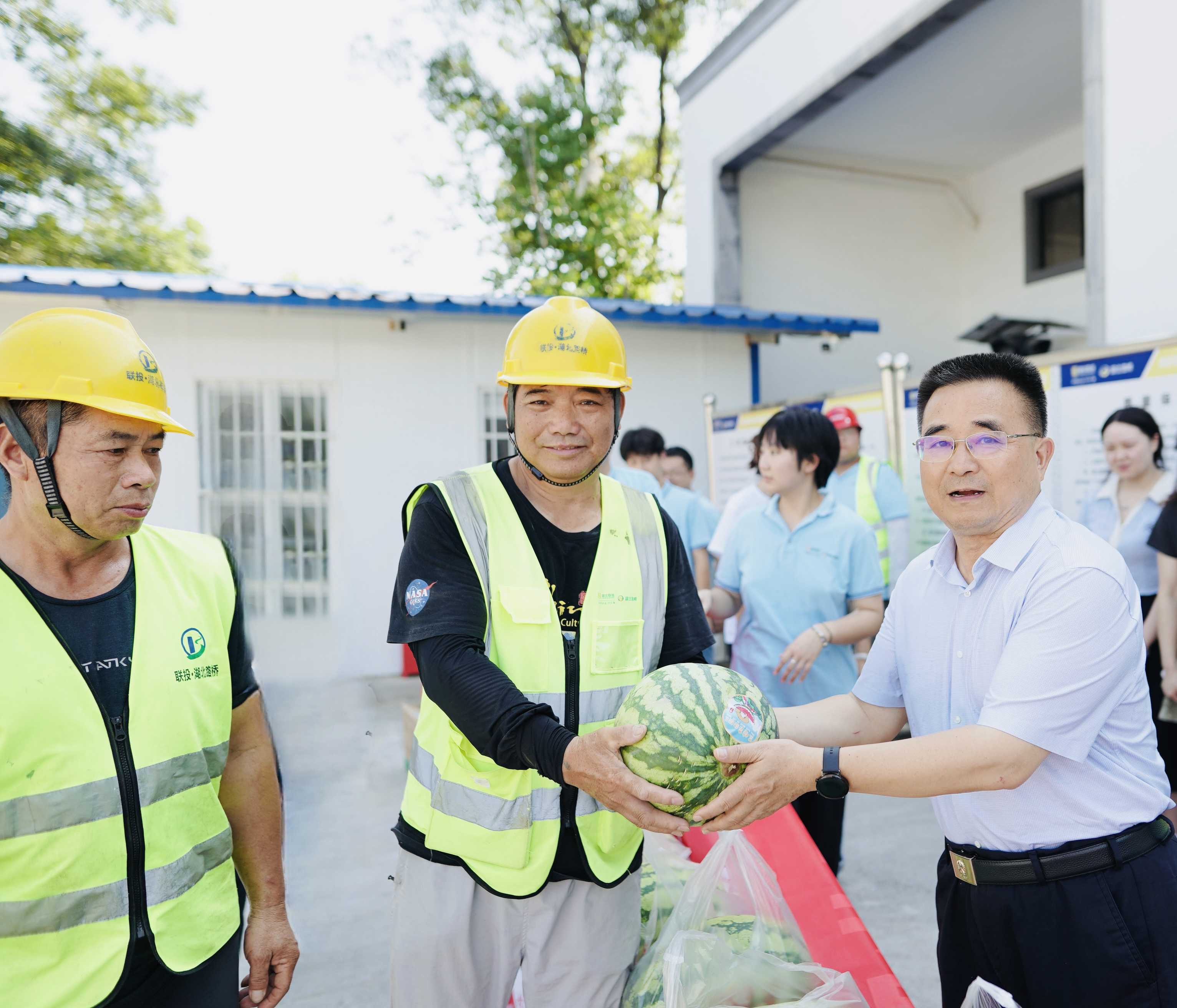 8月8日,湖北聯(lián)投黨委委員、副總經(jīng)理汪繼明赴湖北路橋孝感高新區(qū)交通基礎(chǔ)設(shè)施項(xiàng)目調(diào)研,并開展“送清涼?送健康 送關(guān)愛”系列活動(dòng)。湖北路橋黨委委員、副總經(jīng)理、工會(huì)主席王華瑞,副總經(jīng)理曾祥能陪同調(diào)研。