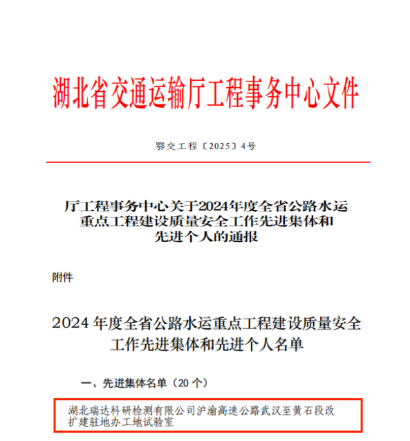 近日,湖北省交通運(yùn)輸廳工程事務(wù)中心發(fā)布了《關(guān)于2024年度全省公路水運(yùn)重點工程建設(shè)質(zhì)量安全工作先進(jìn)集體和先進(jìn)個人的通報》,瑞達(dá)科研檢測公司武黃改擴(kuò)建高速公路駐地辦工地試驗室在工程建設(shè)過程中扎實落實安全質(zhì)量責(zé)任,切實履行檢測機(jī)構(gòu)使命,憑借突出表現(xiàn)榮獲“先進(jìn)集體”稱號。