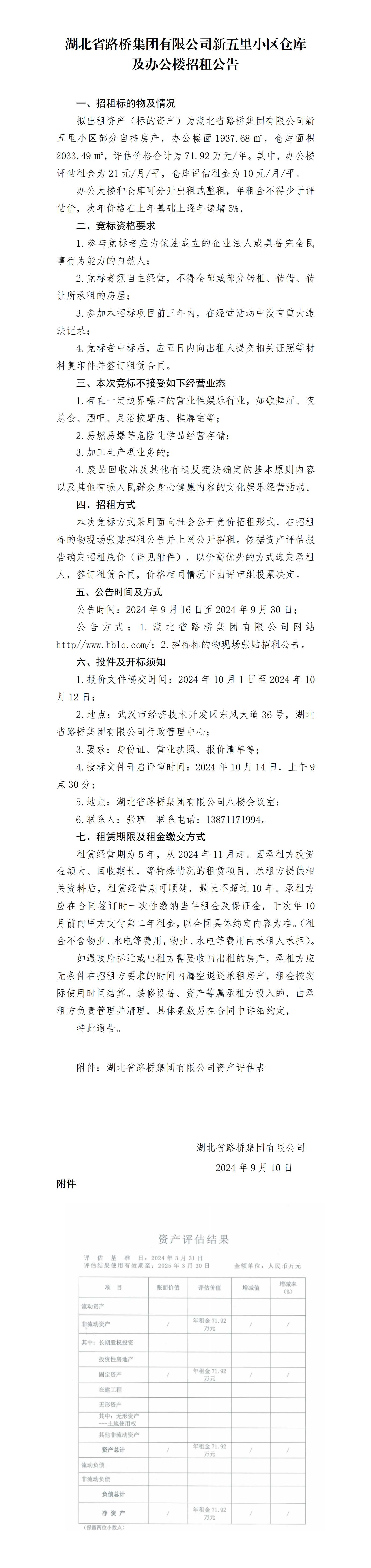 湖北省路橋集團(tuán)有限公司新五里小區(qū)倉(cāng)庫(kù)及辦公樓招租公告
